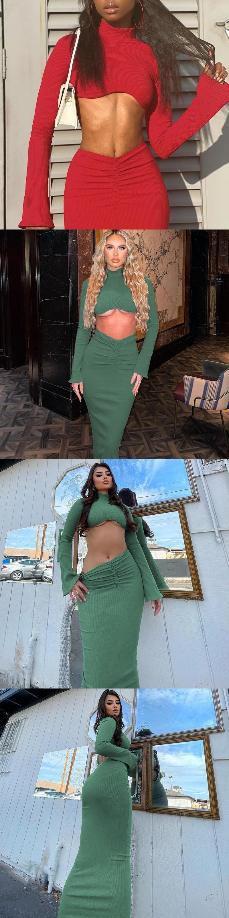 送料無料 Mozision リブ長袖クロップトップとロングスカートの女性の衣装ソリッドタートルネックフレアスリーブドレスセット 2 点セット ソリッドカラー AE121288846836656623