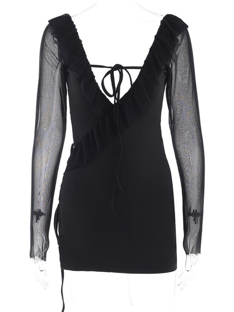 送料無料 Mozision シアーメッシュスリーブフリルミニドレス女性ローブ夏ディープ V ネック背中の開いたボディコンスプリットショートドレス Vestidos サマー 夏物 Vネック AE121288883617208422