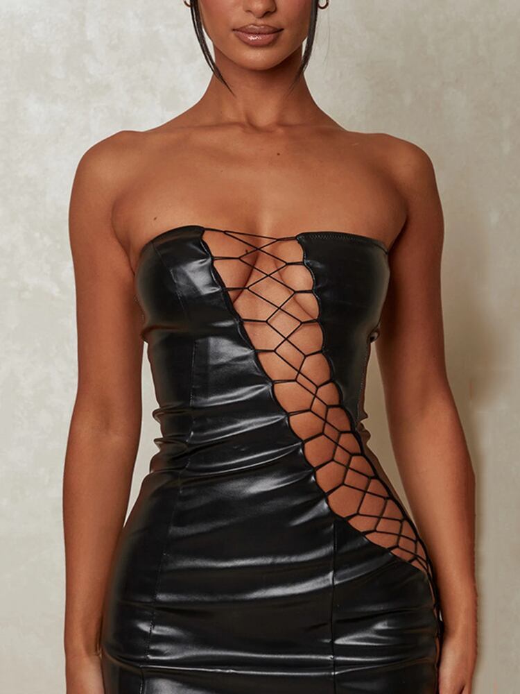 送料無料 暗号レースアップ包帯オフショルダー Pu レザーミニドレス女性秋服ショートドレスパーティークラブ服 AE123565588755573177122