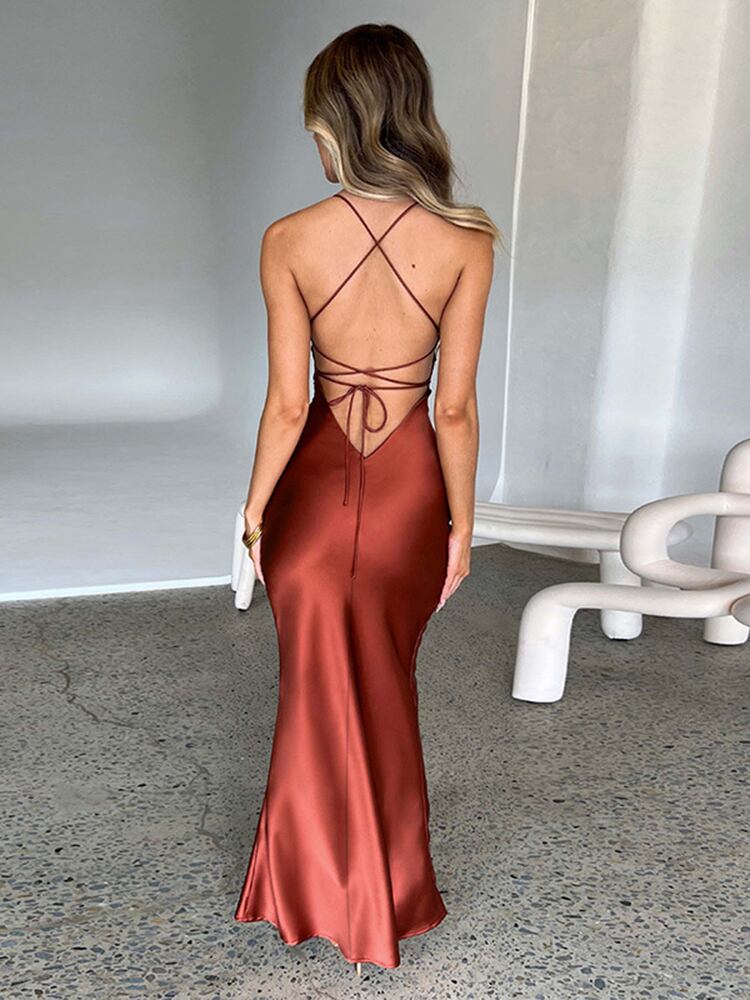 送料無料 暗号セクシーな背中の開いた包帯パーティーマキシドレス女性サテン秋服ガウンレースアップスリップドレスクラブ服 AE123565588727263735002