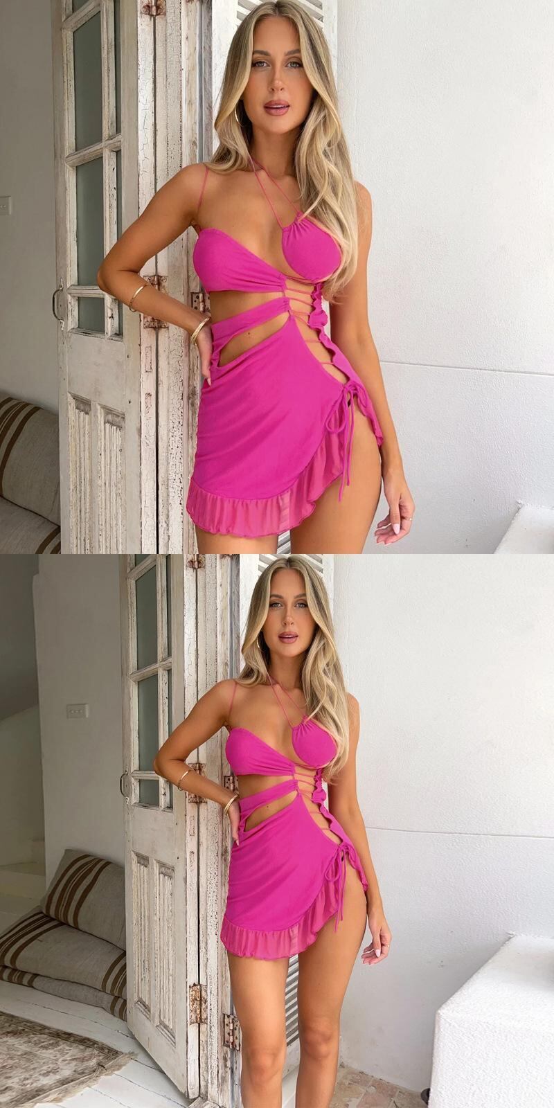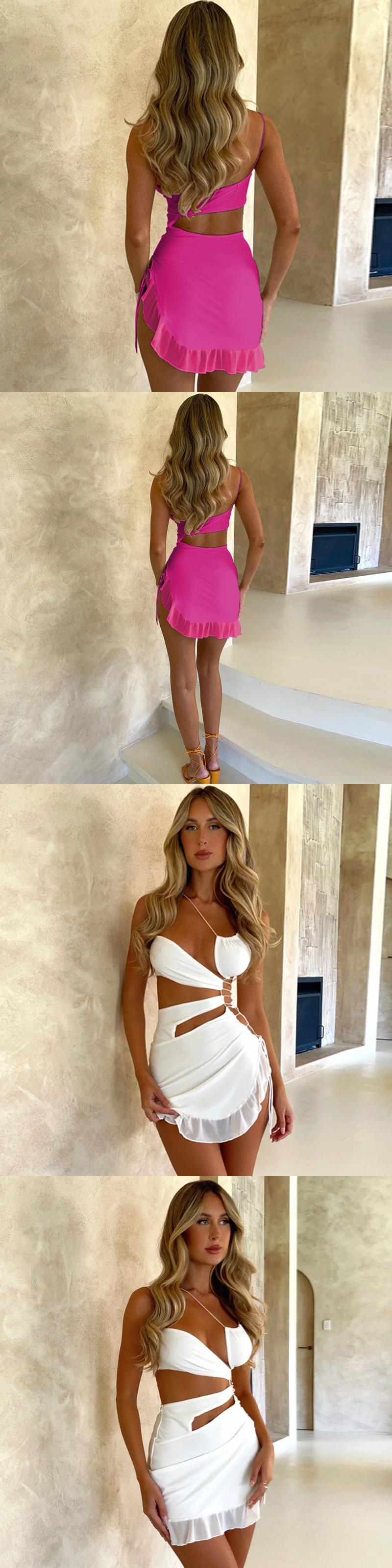 送料無料 暗号不規則なセクシーなカットアウト包帯ミニドレスの女性の衣装夏フリルクラブパーティーノースリーブドレスホリデー サマー 夏物 AE123565588744666092968
