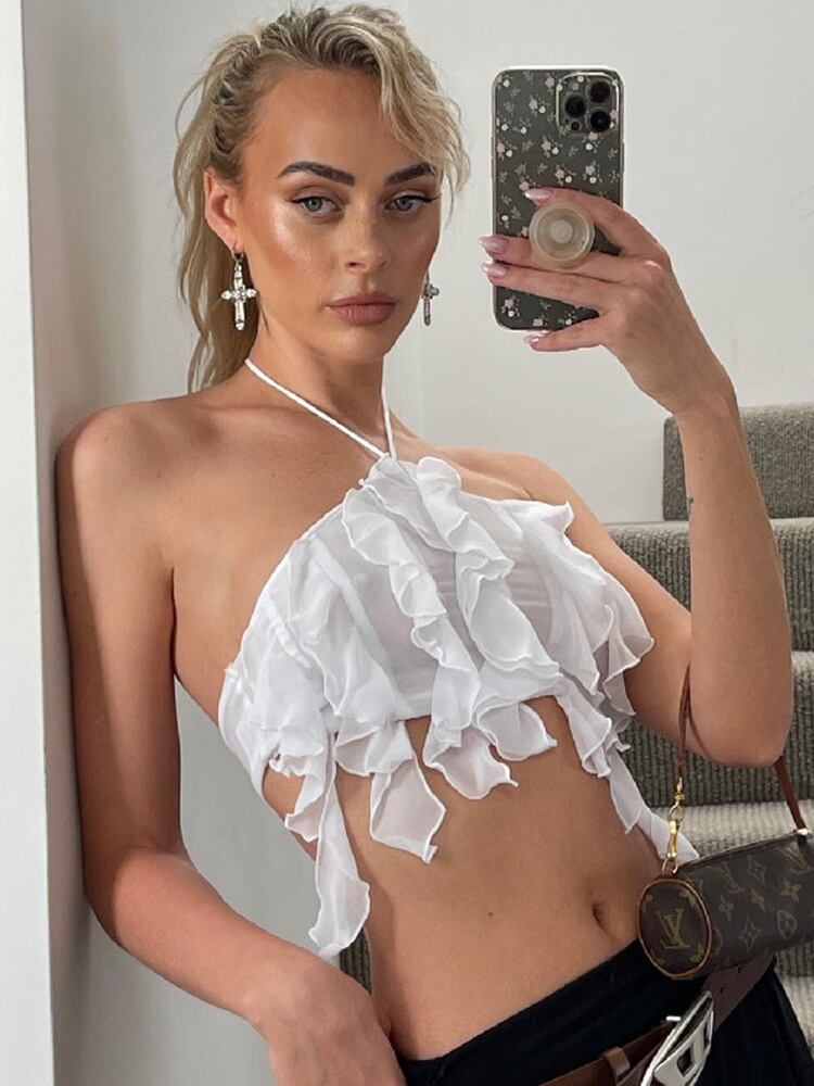 送料無料 暗号メッシュ薄手のホルタークロップトップス女性クラブパーティーセクシーな背中の開いた夏 Y2K フリルトップスストリート服 サマー 夏物 AE123565588724721988894