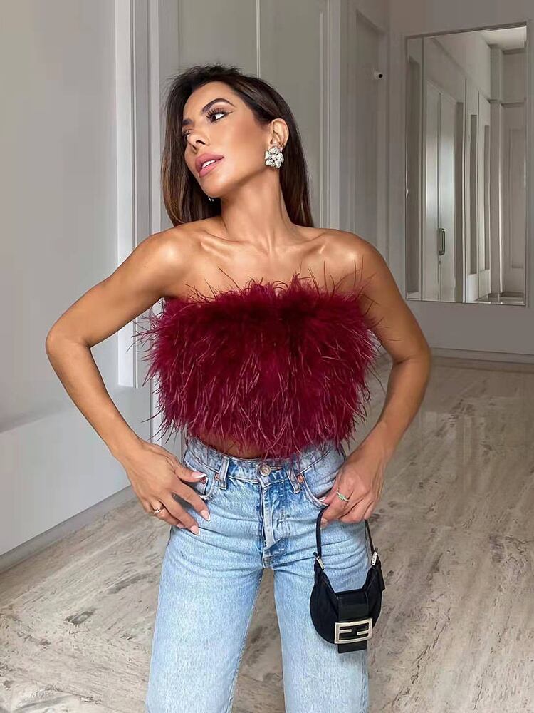 送料無料 暗号ふわふわファーセクシーなストラップレスクロップトップ女性妖精グランジノースリーブバックレスクロップチューブトップクラブパーティー服 AE123565588794118286156