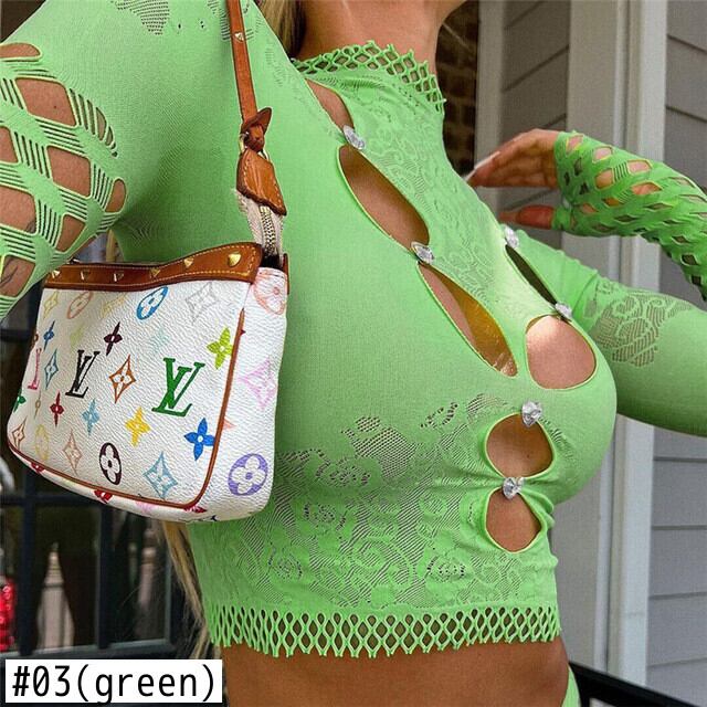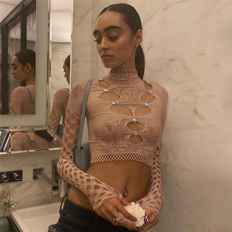 送料無料 暗号中空アウトセクシーな女性のトップスクロップド長袖夏スリムトップスクロップドクラブパーティーストリート ロング サマー 夏物 AE123565588743962140564