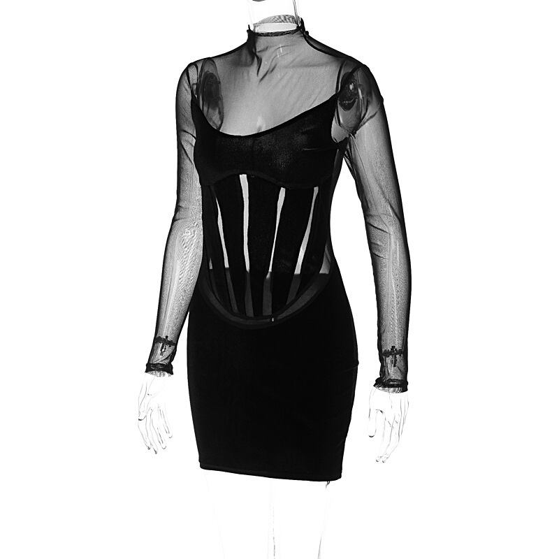 送料無料 暗号メッシュシースルーセクシーなコルセットミニドレス女性衣装クラブパーティー長袖女性のドレスボディコン ロング AE123565588763607928364