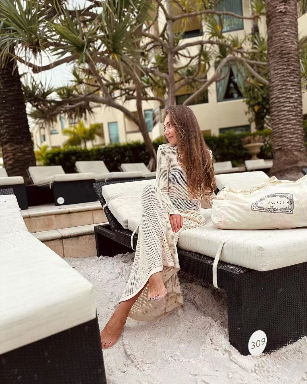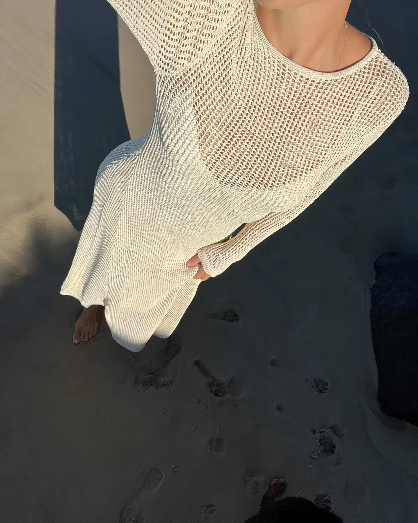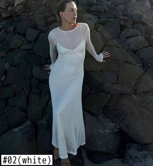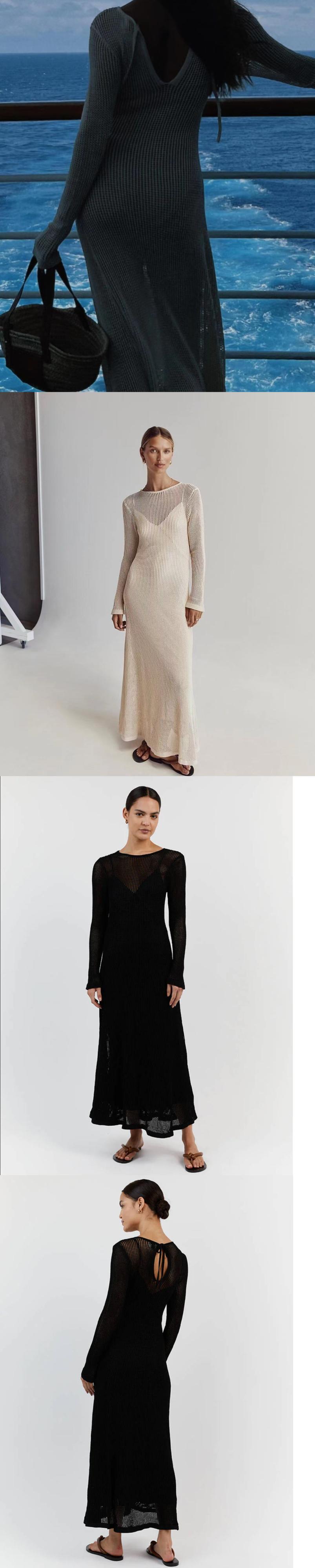 送料無料 暗号中空アウトニットマキシドレス女性 2023 夏のビーチウェアホリデー長袖カバーアップロングドレス サマー 夏物 AE123565588752379887238