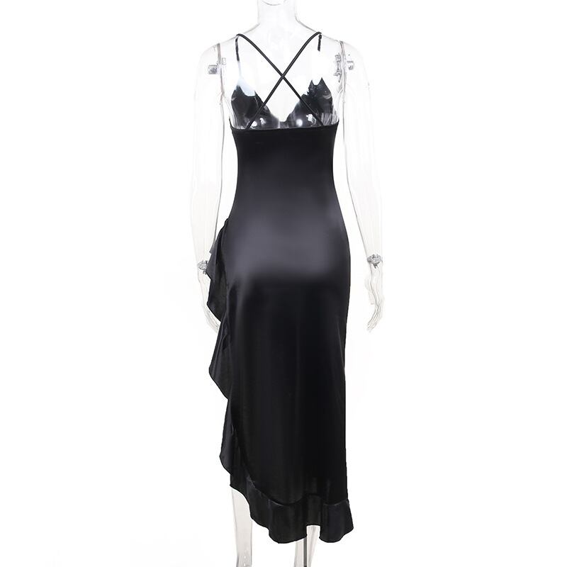 送料無料 暗号フリルストラップミディドレスガウン夏服女性のセクシーな背中の開いたクラブパーティーライズスプリットドレス ラッフル サマー 夏物 AE123565588710696901537