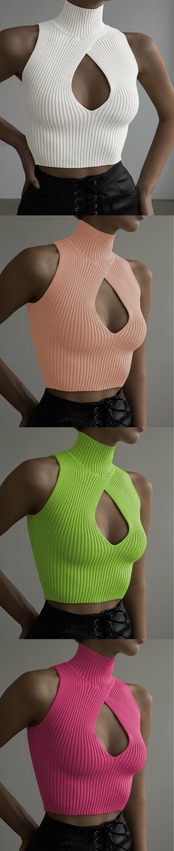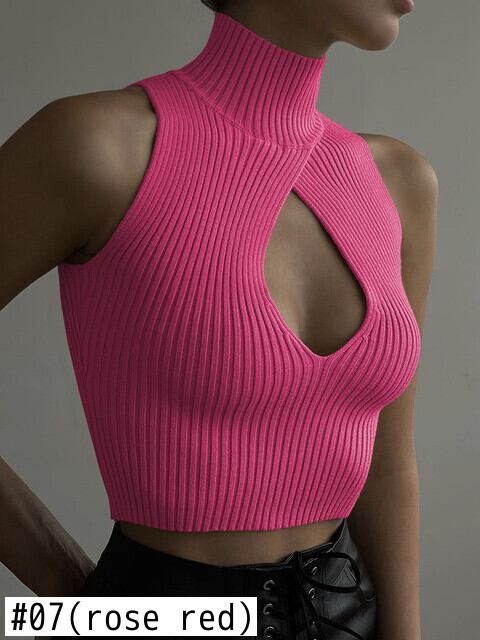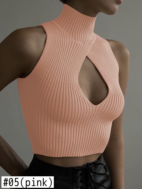 送料無料 暗号セクシーなカットアウトトップ女性ノースリーブニットショートタンクトップタートルネッククラブパーティー夏服 サマー 夏物 AE123565588765310427769