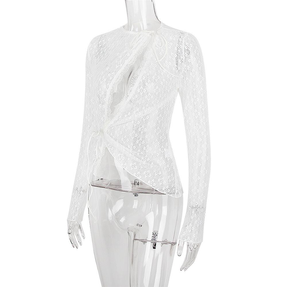 送料無料 暗号セクシーなレース透明中空アウトトップス女性の衣装秋トップスタイアップ長袖 Tシャツ服 ロング AE12356558876414678404