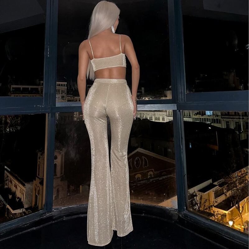 送料無料 暗号グリッタートップとパンツセットセクシーなウエストフレアパンツ夏服女性ツーピースマッチングセット サマー 夏物 AE12356558876042663999 | 女性の為の通販サイト-fashion navi