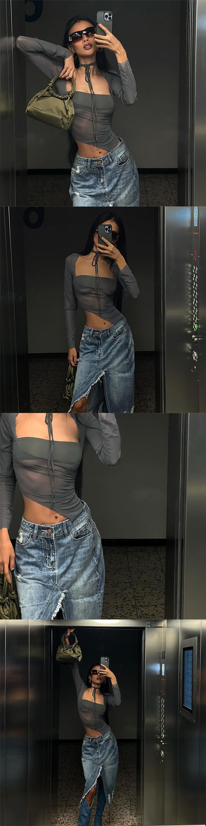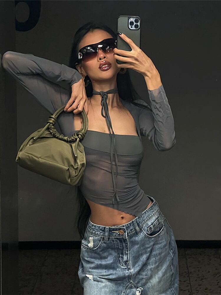 送料無料 暗号メッシュ薄手のホルタートップス女性スクエアカラー半袖 Tシャツトップ Tシャツクロップ Y2K クラブパーティーストリート ショート ハーフスリーブ スクウェア AE123565588764580179422