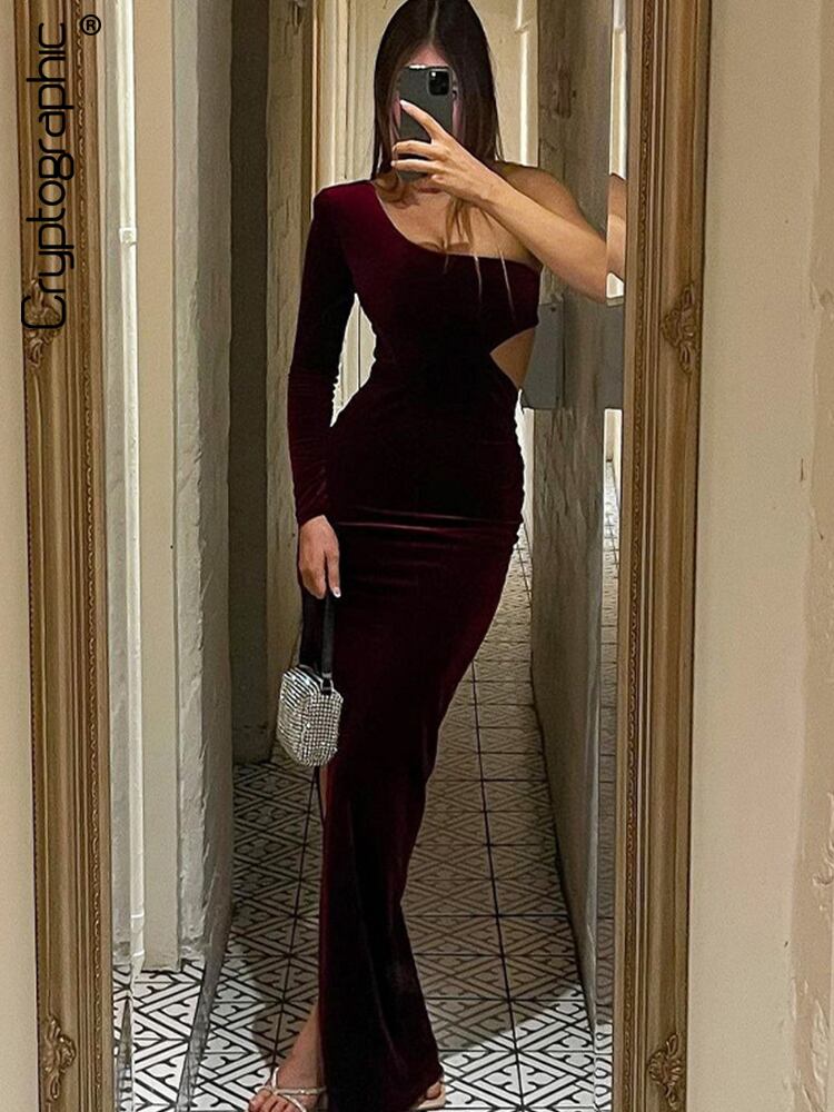 送料無料 暗号ベルベットのセクシーなカットアウトワンショルダーマキシドレス女性衣装長袖ガウンドレスパーティークラブ服 ロング AE123565588734906051297