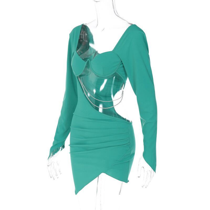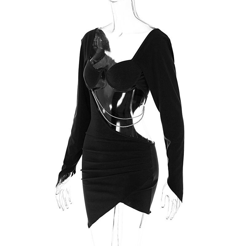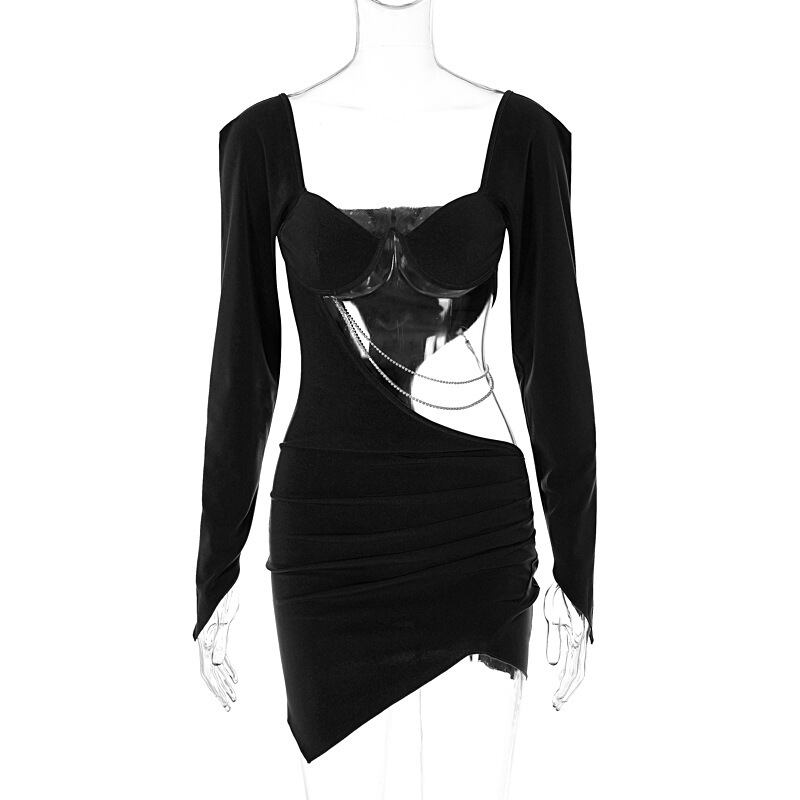 送料無料 暗号秋スクエアカラースリットミニドレス女性のセクシーなカットアウトサイドチェーンクラブパーティーシャーリングボディコンドレスガウン スクウェア AE123565588793536019686