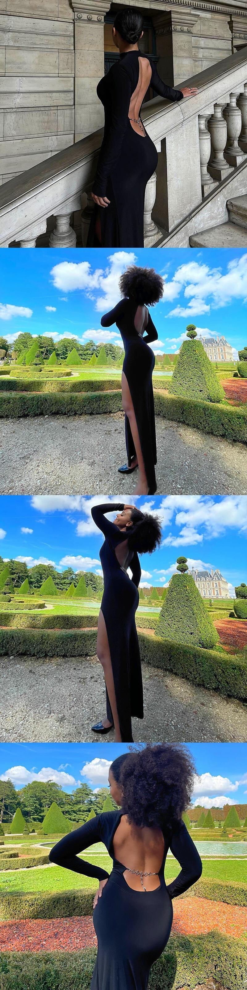 送料無料 暗号セクシーなカットアウトチェーンバックレスマキシドレス女性パーティークラブ長袖スリットロングドレス秋服 オータム 秋物 AE123565588743994484648