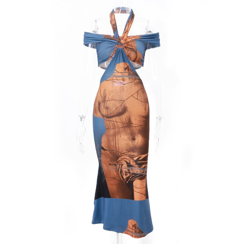 送料無料 暗号セクシーな背中の開いたホルターマキシドレス夏の休日の衣装女性クラブパーティーカットアウトプリントドレス Vestido サマー 夏物 AE123565588779351139538