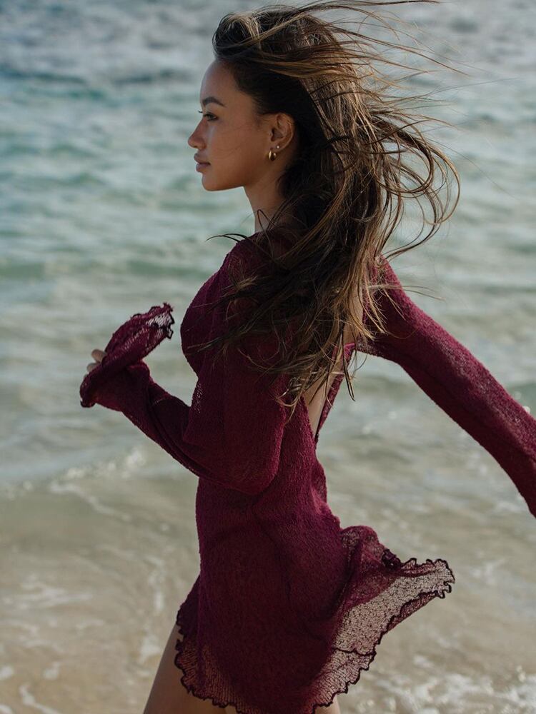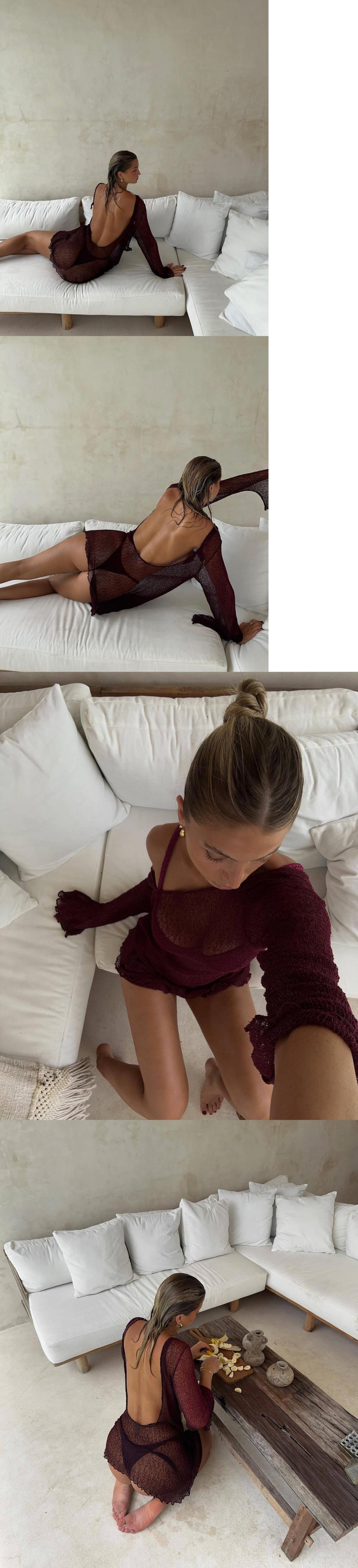 送料無料 暗号夏シースルーセクシーな背中の開いたスリムビーチウェアビキニカバーアップドレスボヘミアン長袖ニットショートドレスホット ロング サマー 夏物 AE123565588725823561831