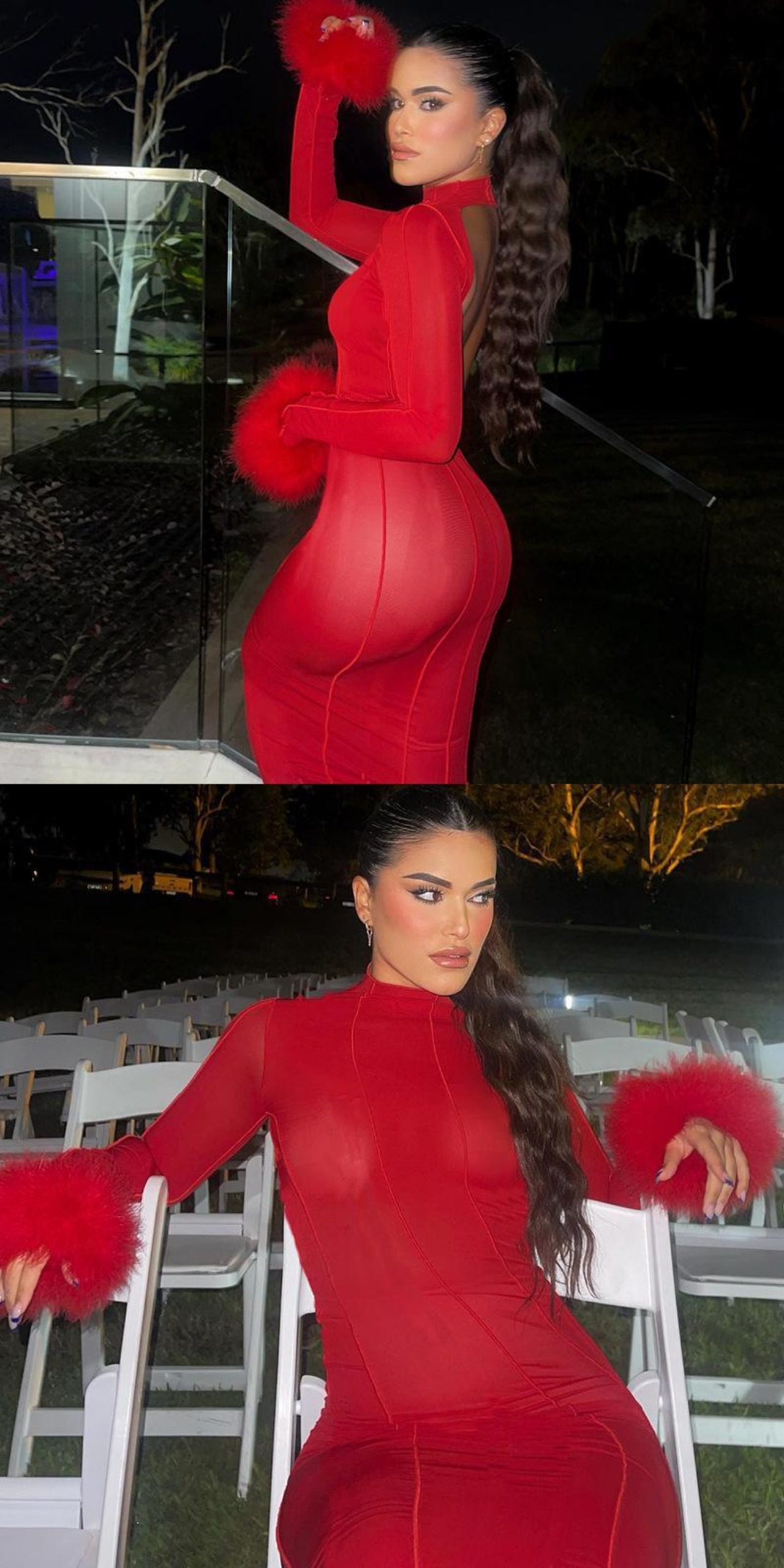 送料無料 暗号毛皮の羽長袖マキシドレス衣装女性のセクシーな背中の開いた赤いガウンドレスローブパーティー服 ロング レッド AE123565588728691809322