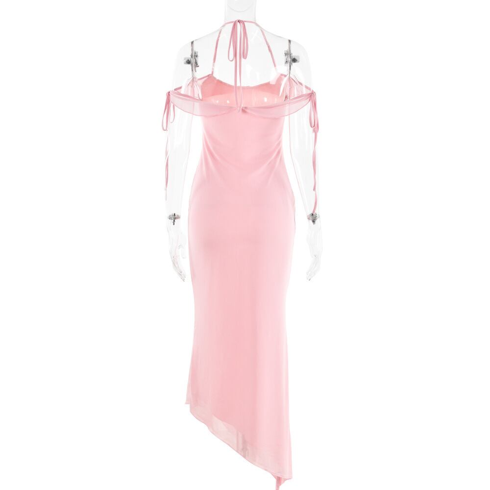 送料無料 暗号メッシュホルター妖精ドレスクラブパーティーオフショルダー衣装女性ピンクスプリットマキシドレスウエディング夏 2023 サマー 夏物 AE12356558872173754216
