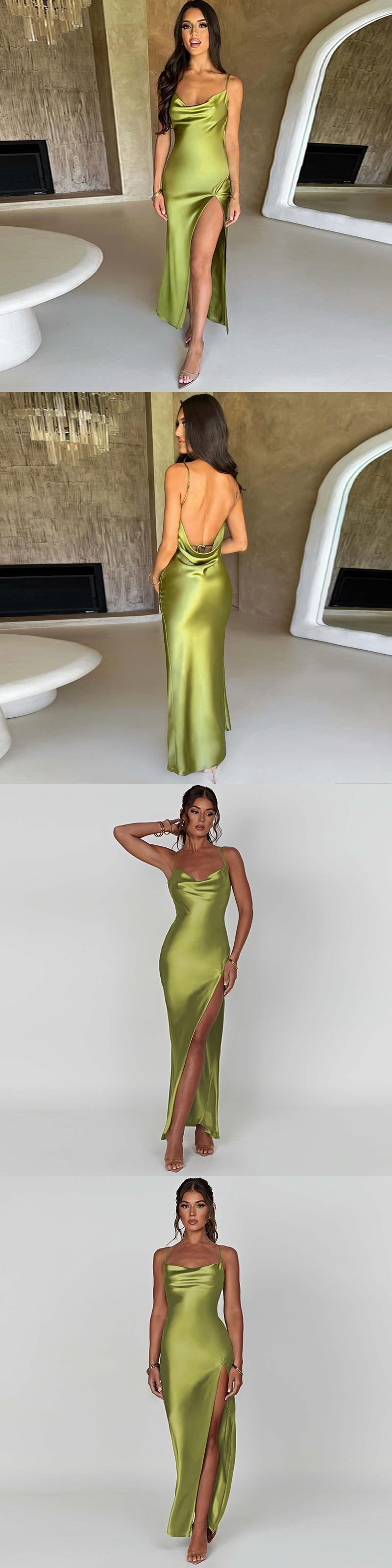 送料無料 暗号スパゲッティストラップスリットドレープマキシドレス夏服女性の誕生日クラブパーティーサテン背中の開いたドレス サマー 夏物 AE123565588785008534513