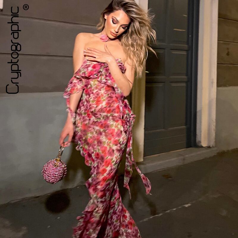 送料無料 暗号フリルセクシーな背中の開いた花柄シースルーマキシドレス衣装女性サンドレス妖精グランジドレス AE123565588758048327037