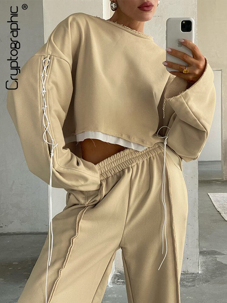 送料無料 暗号スプライス包帯スウェットシャツとパンツのツーピースセットレディース衣装秋冬2022ジャージマッチングセット ウィンター 冬物 AE123565588718048641172