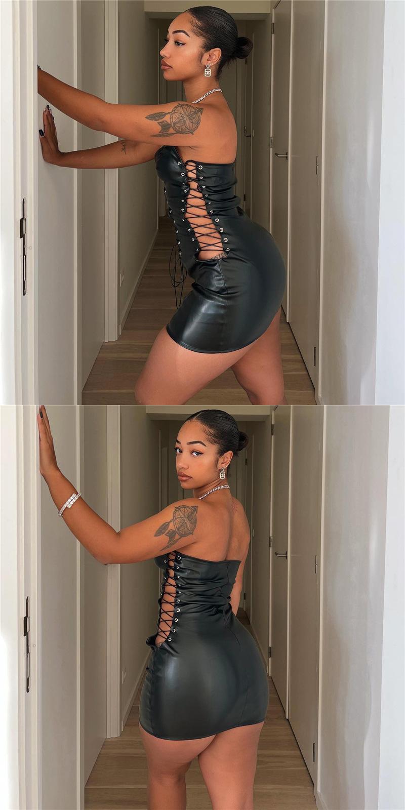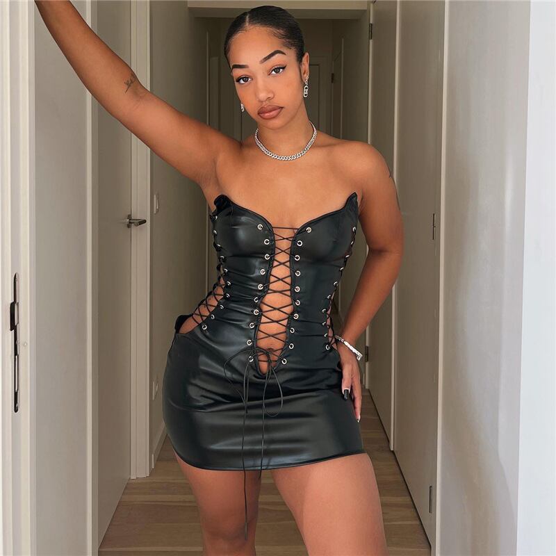 送料無料 暗号化 Pu レザー包帯レースアップセクシーなミニドレス衣装女性ボディコンクラブパーティー背中の開いたドレスストラップレス AE123565588793968128460