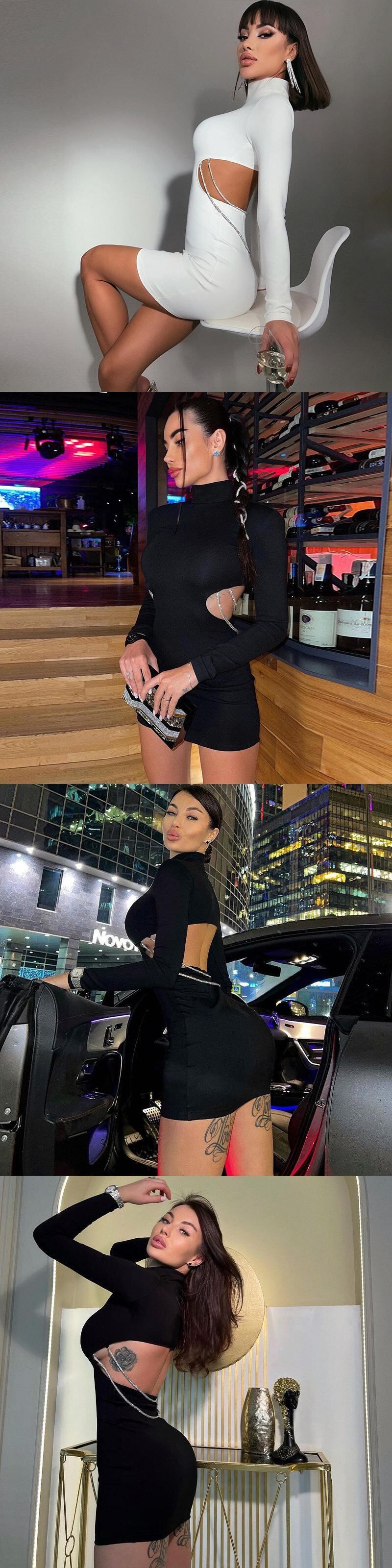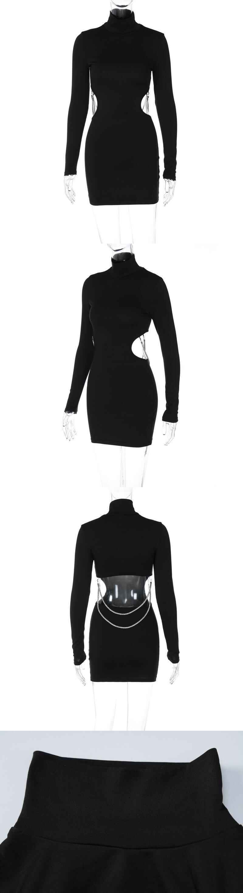 送料無料 暗号チェーンセクシーな背中の開いたカットアウトボディコンドレス女性服クラブパーティー長袖ミニドレス Vestido シック ロング AE1235655887924315094