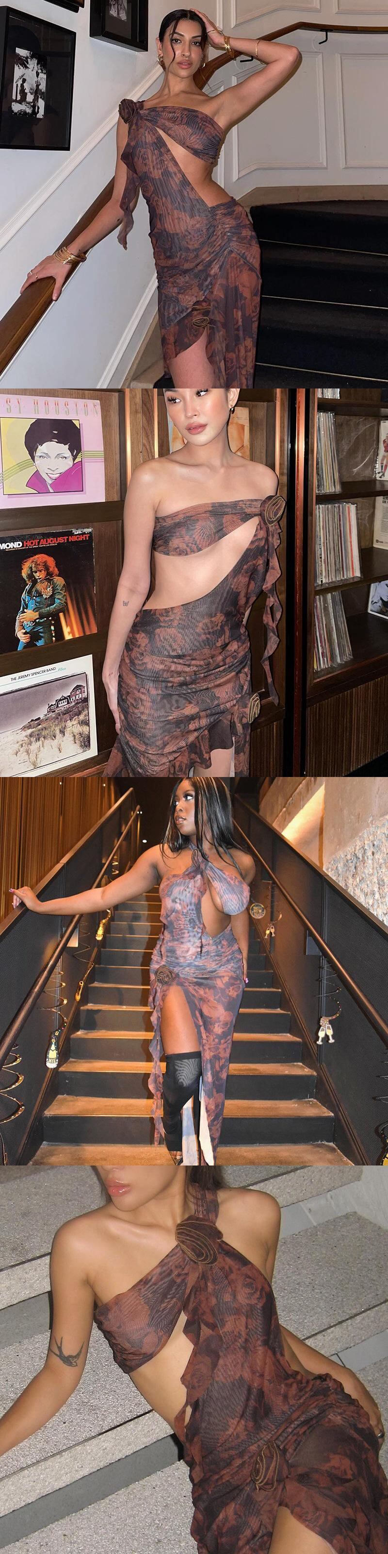 送料無料 暗号アップリケ不規則なカットアウトプリントミディドレス夏のセクシーな背中の開いた衣装女性パーティーフリルシャーリングドレス サマー 夏物 AE123565588744234317757