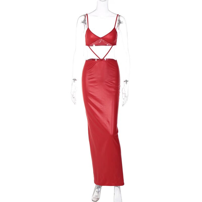 送料無料 暗号セクシーな背中の開いたノースリーブフェイク Pu レザーマキシドレス衣装女性包帯スリットドレスパーティー服 AE123565588718908018315