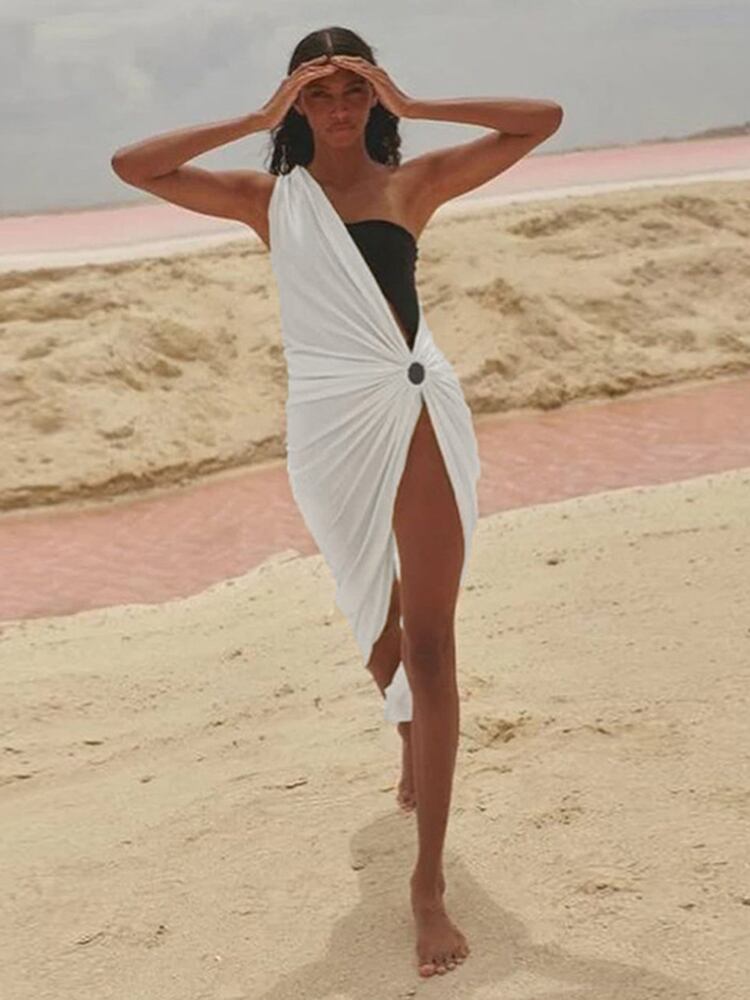 送料無料 暗号中空アウトシャーリングミディドレスワンショルダーノースリーブセクシーな背中の開いた 2023 サマードレスホリデービーチウェアソリッド 夏物 ソリッドカラー AE123565588791738881154