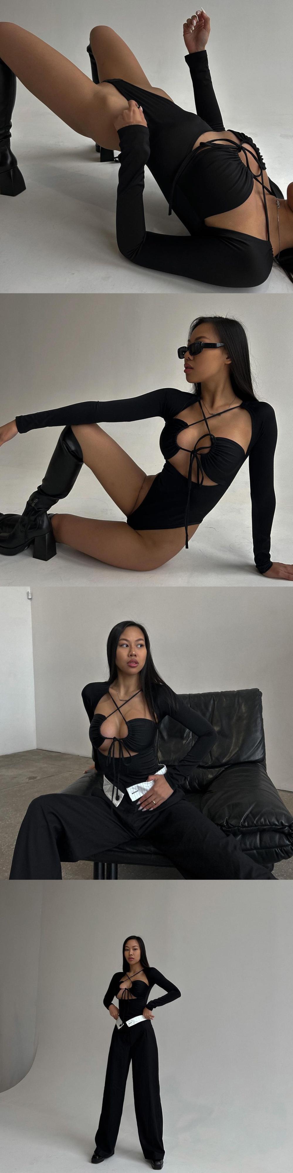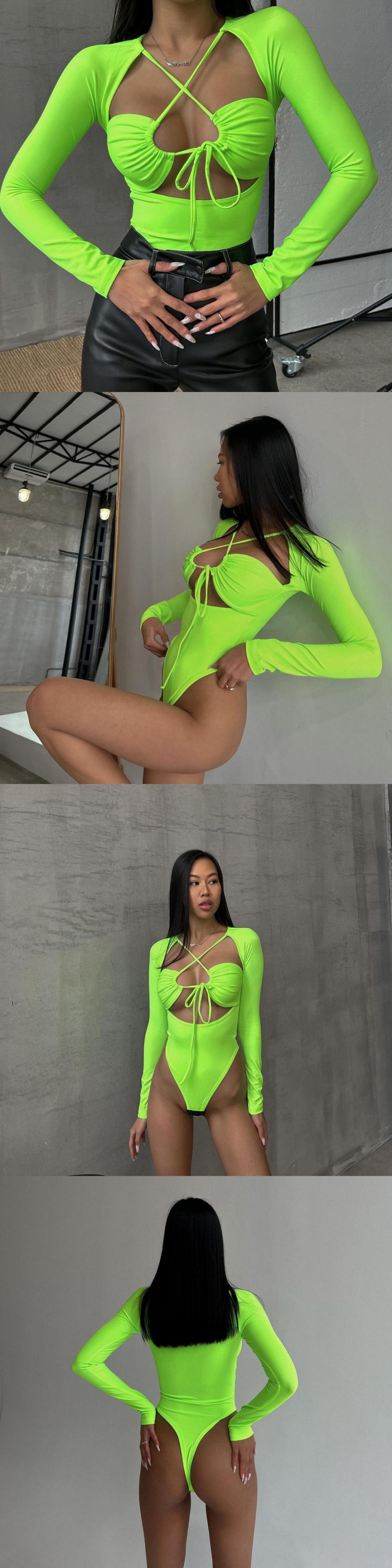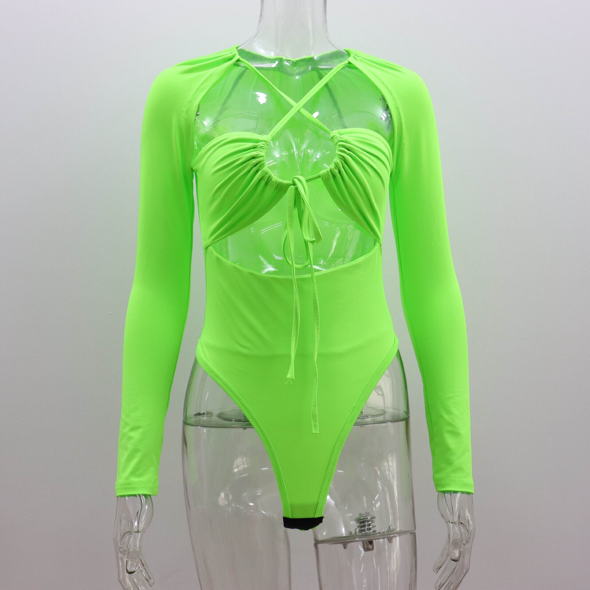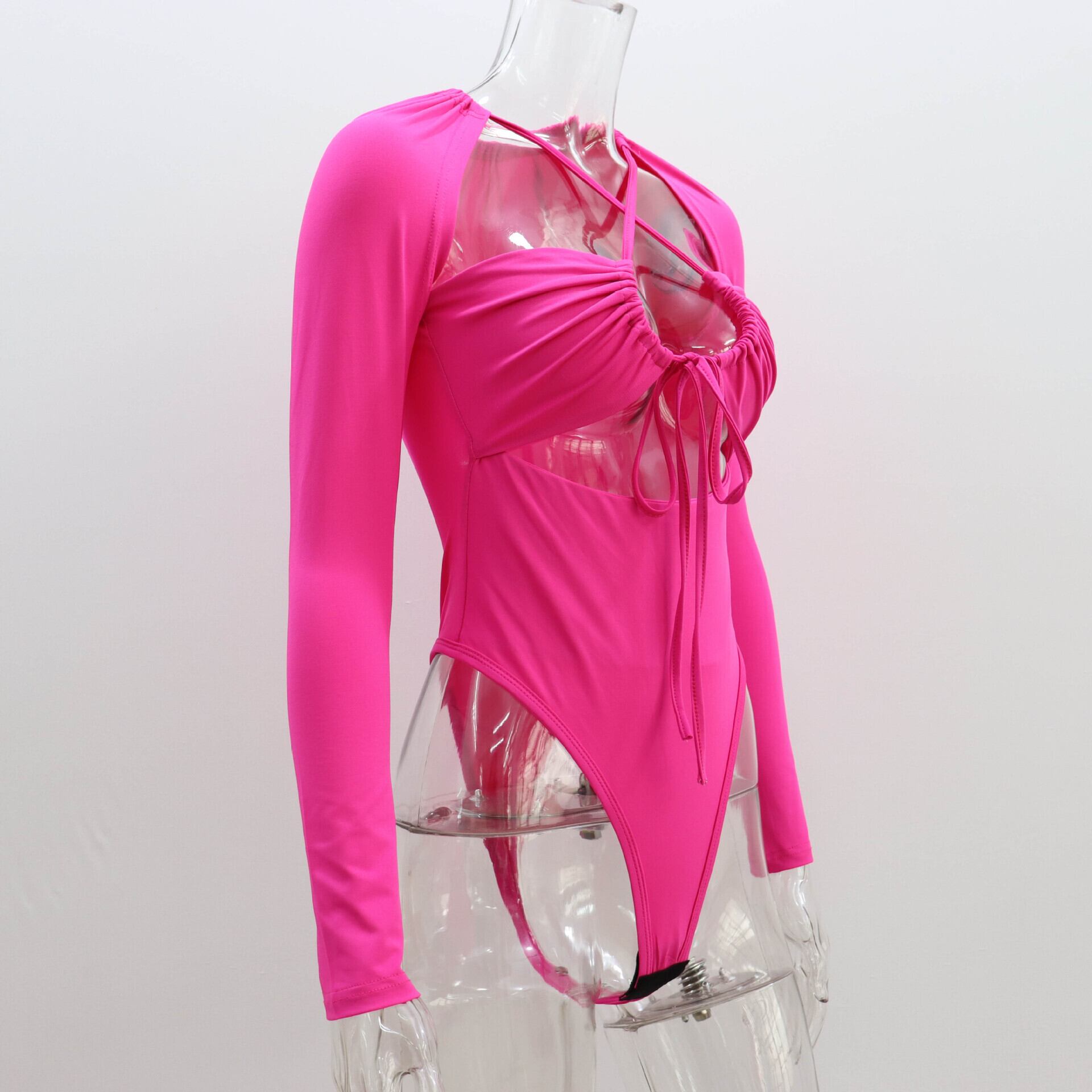 送料無料 暗号ストラップセクシーなカットアウトネクタイフロントトップボディスーツ女性長袖トップスワンピースライズボディスーツロンパース固体 ロング ソリッドカラー AE123565588718537348271
