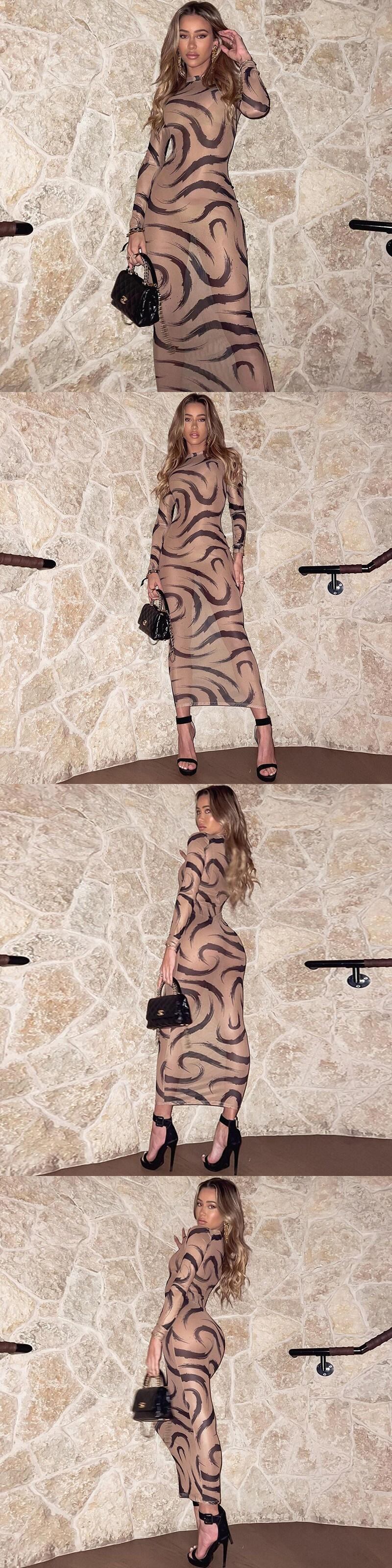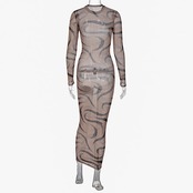 送料無料 暗号プリント長袖マキシドレス夏服女性クラブパーティーメッシュシースルーボディコンドレス Vestido ロング サマー 夏物 AE123565588789956154562