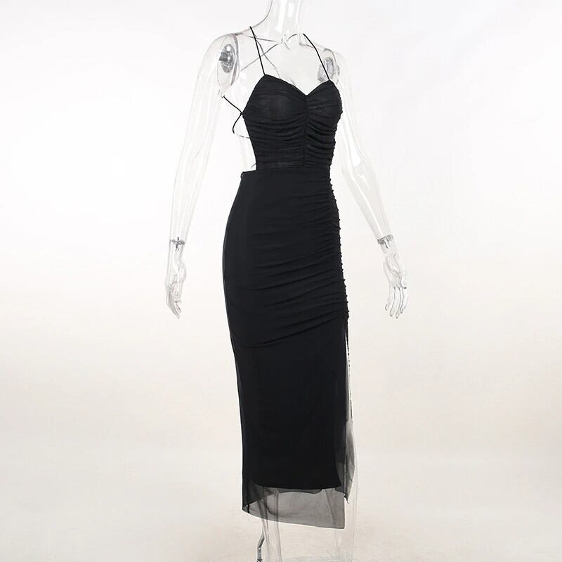 送料無料 暗号シャーリングメッシュシアースリットマキシドレス夏服女性ノースリーブクラブスリップロングガウンドレス服 サマー 夏物 AE123565588776318996890