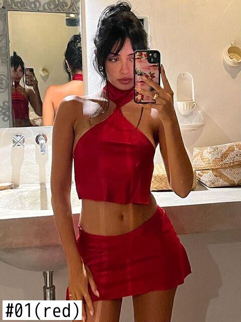 送料無料 暗号化セクシーな背中の開いた夏のトップとスカート 2 点セット衣装女性クラブパーティーホルターノースリーブコーデセット サマー 夏物 AE123565588789518192752