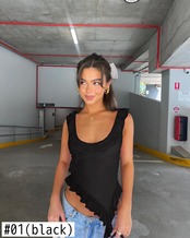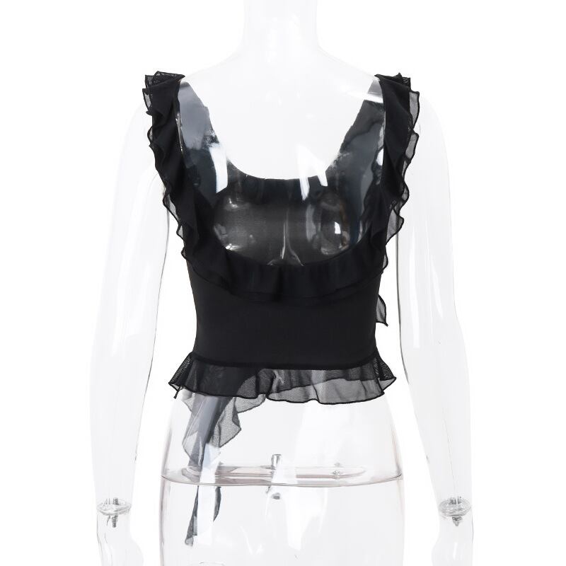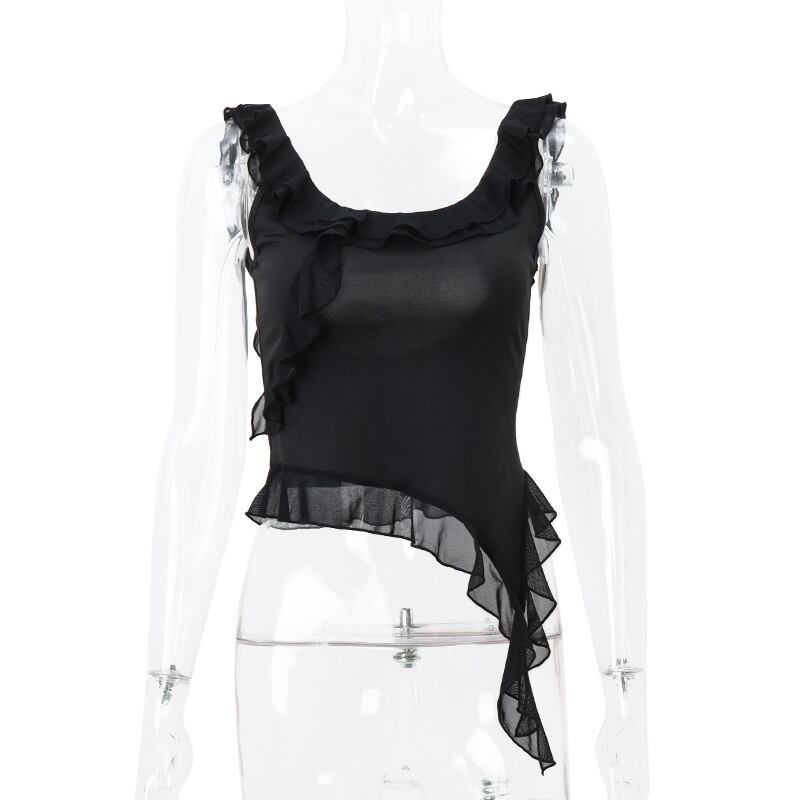 送料無料 暗号フリルメッシュセクシーな背中の開いた不規則なクロップトップスリムノースリーブベストY2Kタンクトップスキニー服 AE123565588771910952472