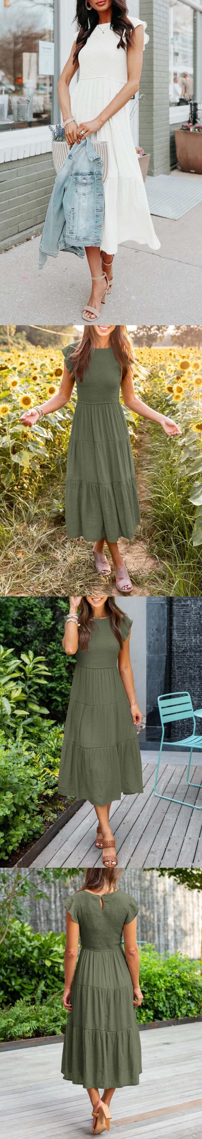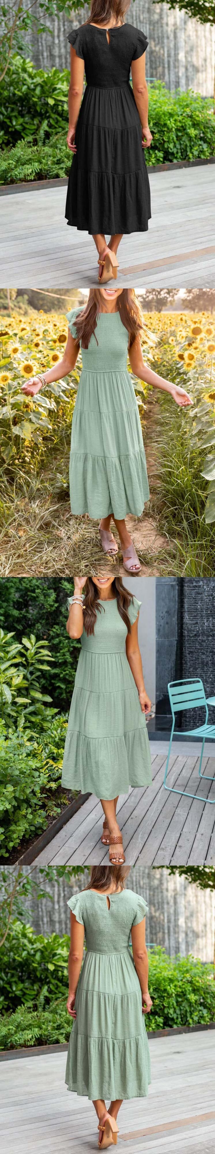 送料無料 夏の女性のプリーツドレス 2023 O ネックフライングスリーブ A ラインドレス固体ルースビーチパーティードレス Vestidos サマー 夏物 Oネック Aライン ソリッドカラー AE1212332256395706380