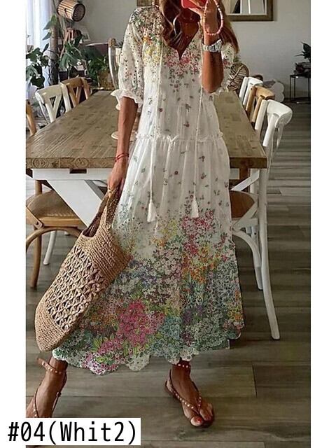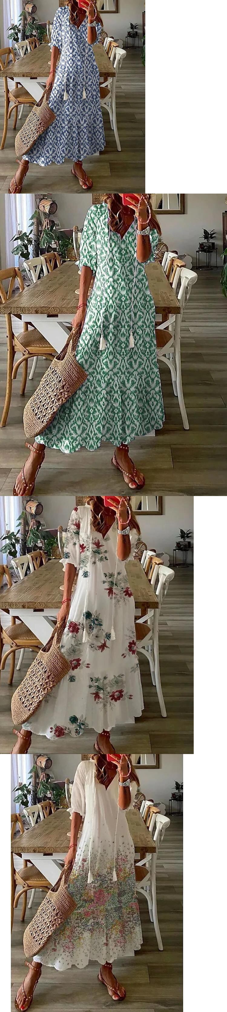 送料無料 女性ヴィンテージロングドレス 2023 夏ボヘミアンプリント V ネック半袖ドレス巾着レースアップルースビーチドレスローブ ハーフスリーブ サマー 夏物 Vネック ビンテージ AE1212332277725611363