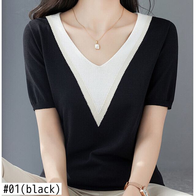 送料無料 Poleras V ネック Tシャツ女性コントラストカラートップニット半袖 Tシャツ 2022 夏の女性の Tシャツ ショート ハーフスリーブ サマー 夏物 Vネック AE1212887722909280173