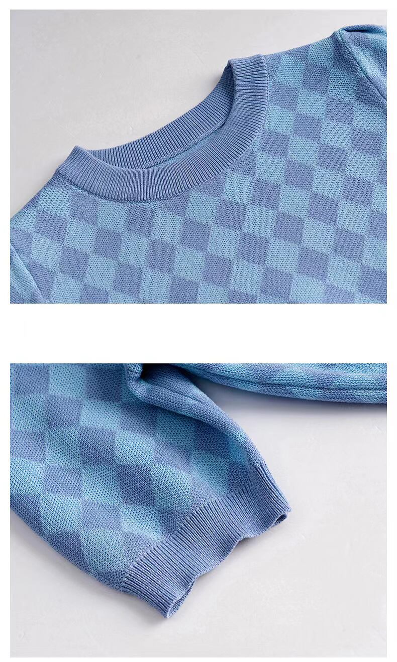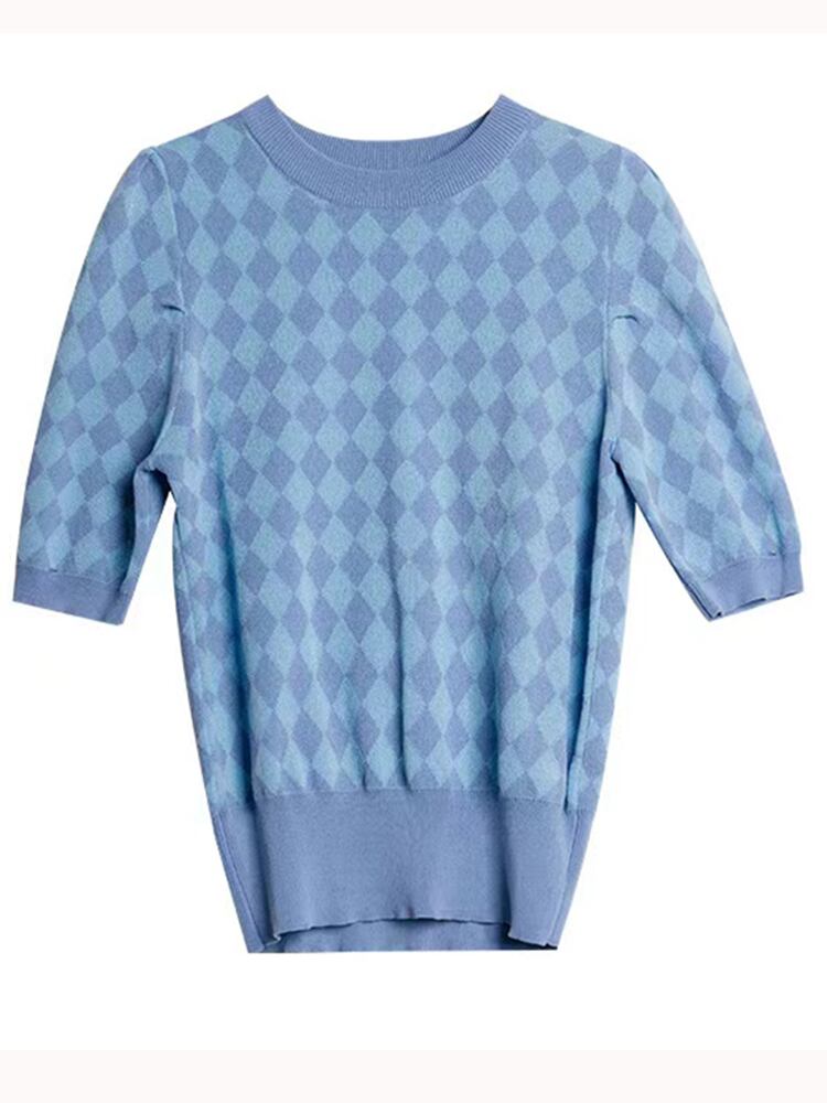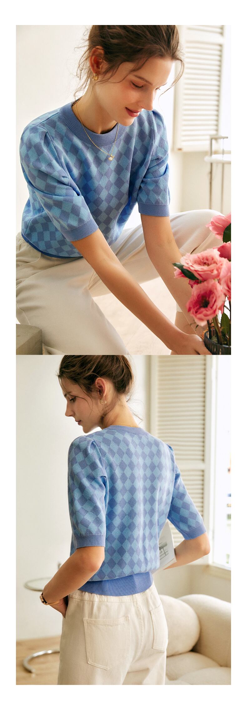 送料無料 ニット Tシャツレディースブルーチェック柄 Tシャツ半袖トップス夏服女性 Tシャツ 2023 ショート ハーフスリーブ サマー 夏物 AE1212887792987395921