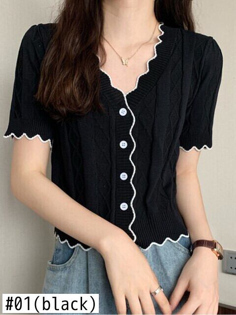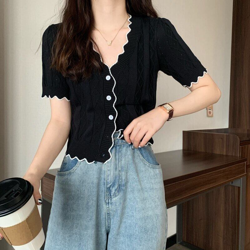 送料無料 カーディガン女性セーター 2022 夏薄型 V ネッククロップトップセーターボタン半袖黒ニットプル ショート ブラック ハーフスリーブ サマー 夏物 Vネック AE1212887782564447746