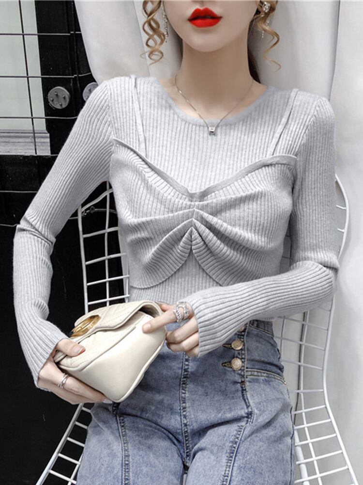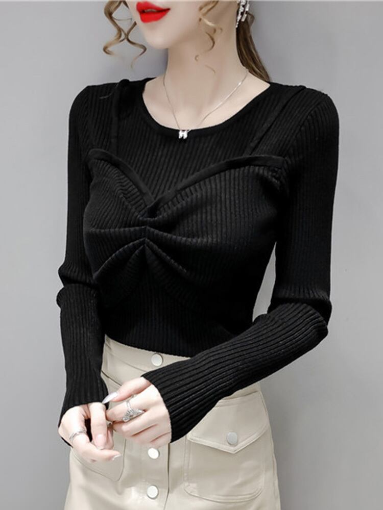 送料無料 偽ツーピースプルオーバーセーター女性 2022 秋冬長袖トップスリム弾性服ニットセーターセーター ロング エラスティック 伸縮 オータム 秋物 ウィンター 冬物 AE1212887797804587153