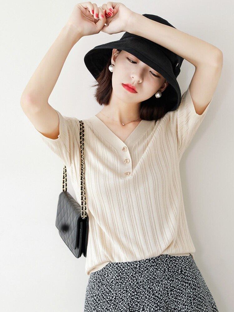 送料無料 V ネックボタンアップトップ女性 Tシャツ 2022 夏半袖 Tシャツニット薄い弾性 Tシャツ ショート ハーフスリーブ エラスティック 伸縮 サマー 夏物 Vネック AE121288773481138615
