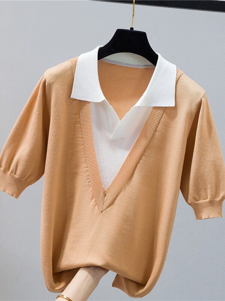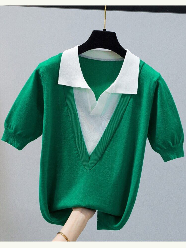 送料無料 偽ツーピースターンダウンカラートップ 2022 ニットセーター女性の夏の薄いプルオーバーセータープル サマー 夏物 AE1212887747264879465