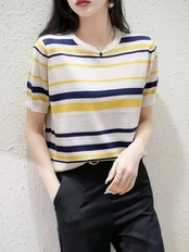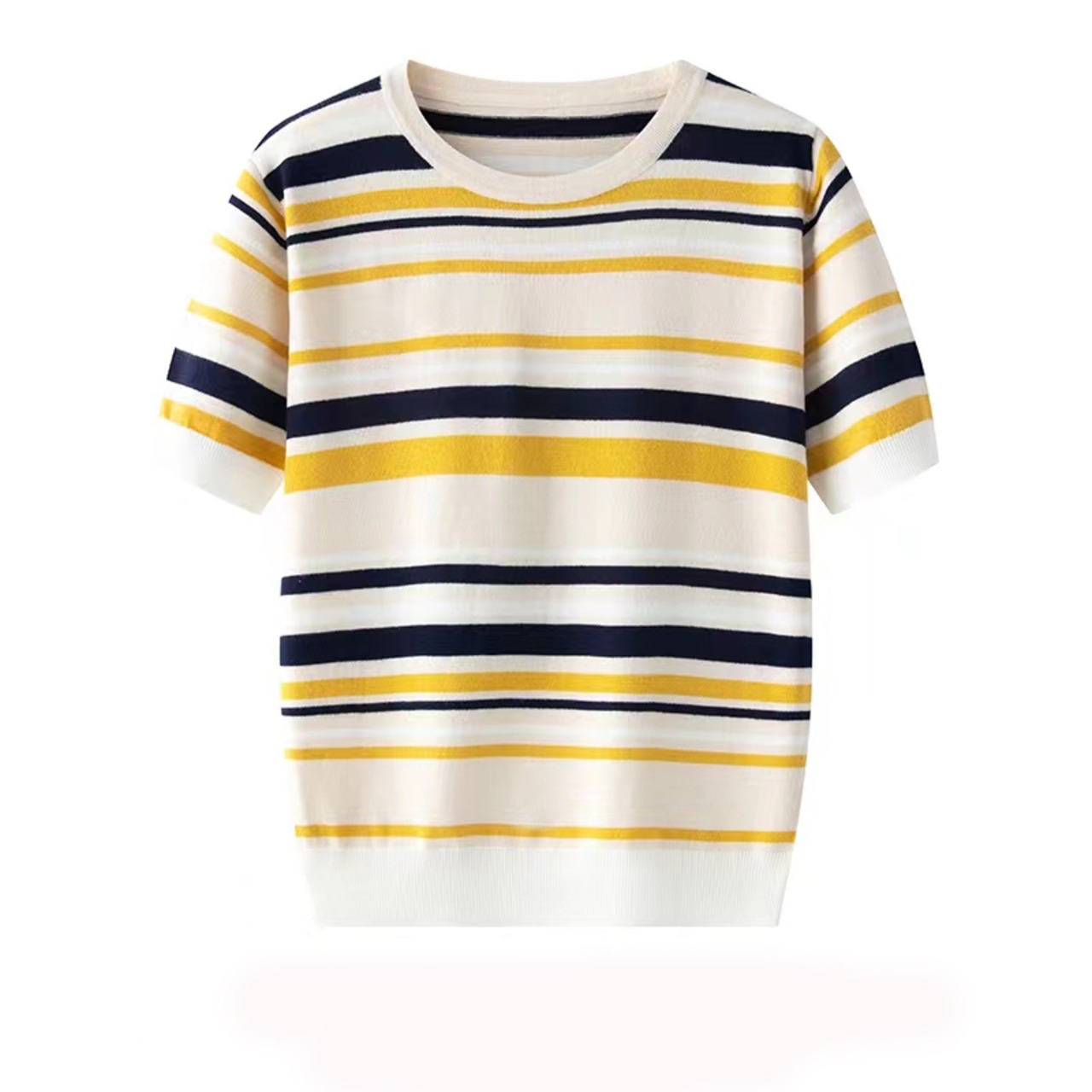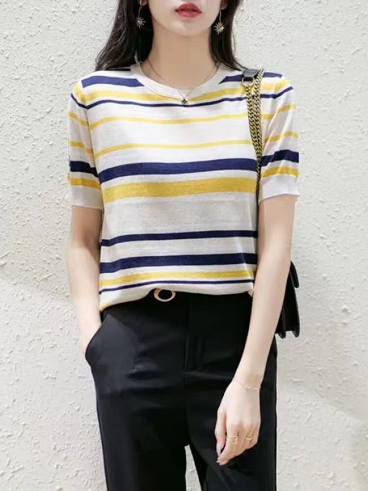送料無料 セーター 2022 夏ストライプニットセーター女性ルーズ女性半袖トップ O ネックプルオーバープル ショート ハーフスリーブ サマー 夏物 Oネック AE1212887746060358965