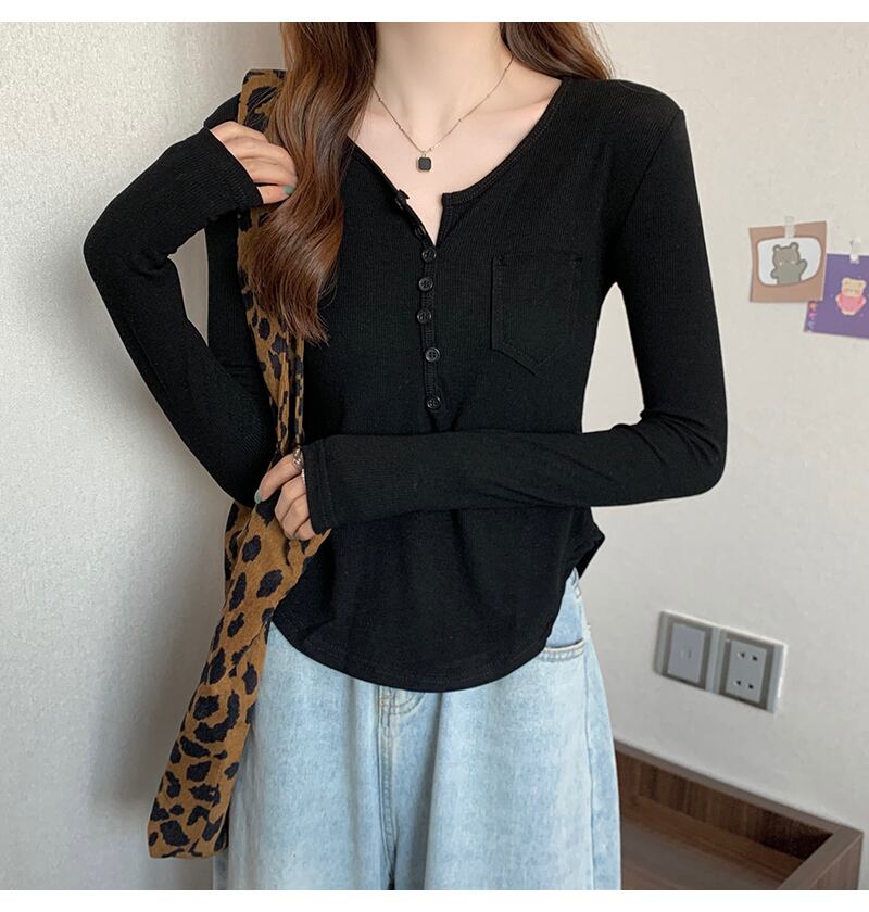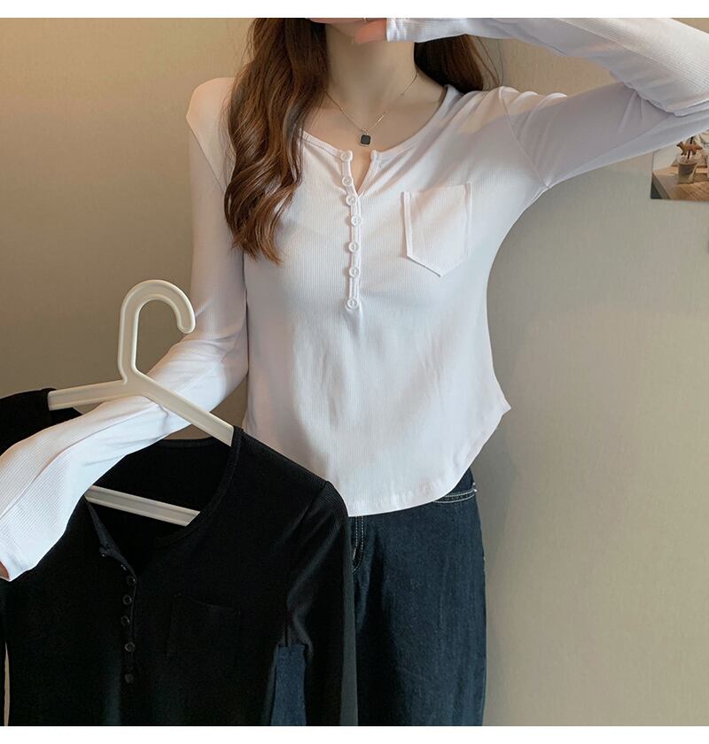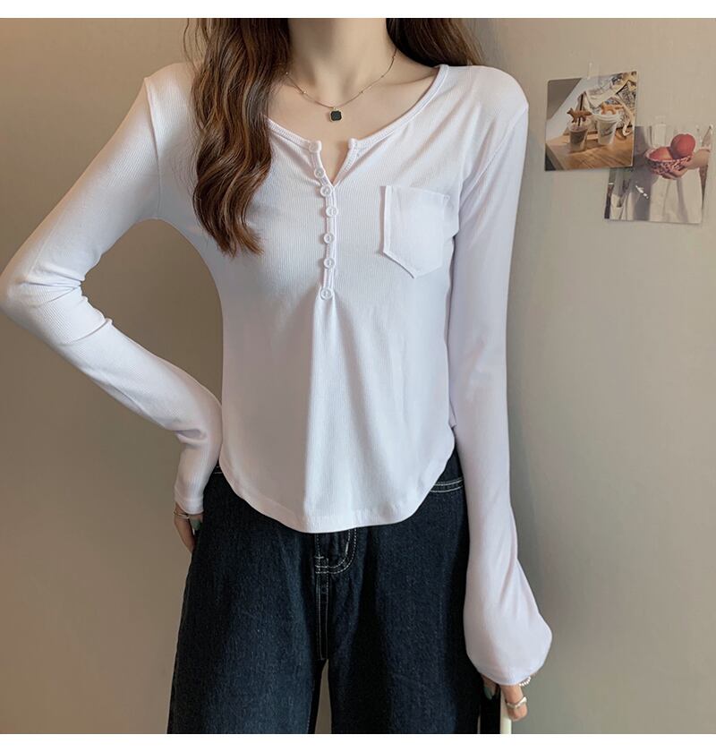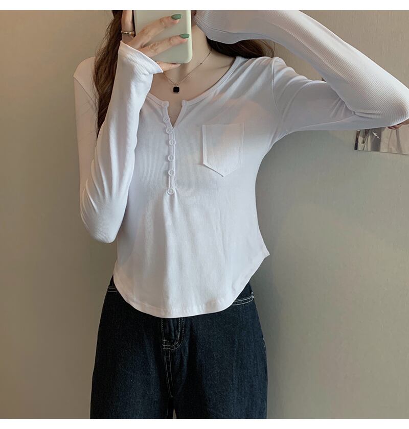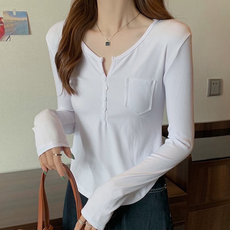 送料無料 ボタン V ネック長袖スリムコットン Tシャツ女性 2022 春秋トップスポケット白 Tシャツ ロング ホワイト スプリング 春物 オータム 秋物 Vネック AE1212887734843662133