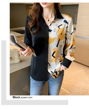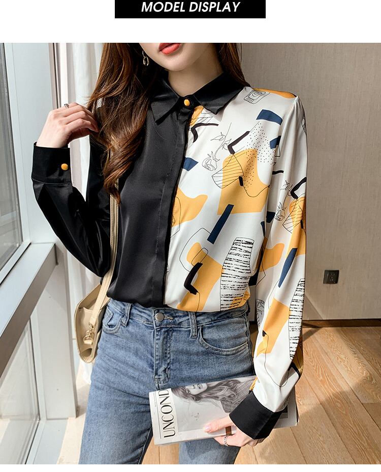 送料無料 ヴィンテージ対照的なカラープリントブラウス女性長袖トップターンダウンコラシャツシフォンブラウス 2022 春の女性の服 ロング スプリング 春物 ビンテージ AE1212887789091782362