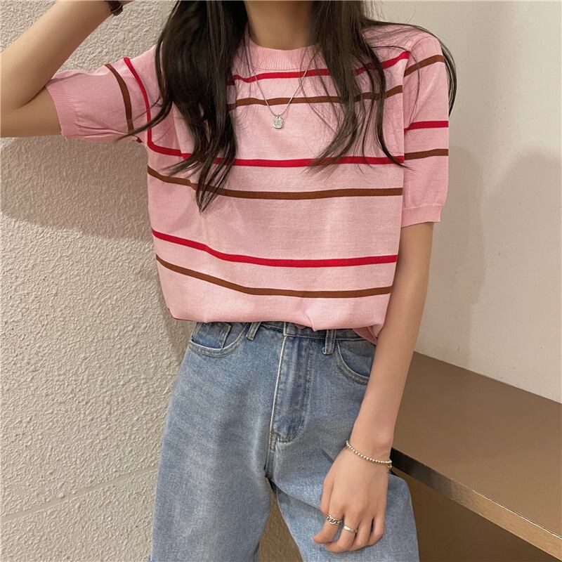 送料無料 ストライプニット Tシャツ半袖 Tシャツ夏の女性の服トップ O ネックオールマッチ弾性 Ladis Tシャツ ショート ハーフスリーブ エラスティック 伸縮 サマー 夏物 Oネック AE1212887724205600474