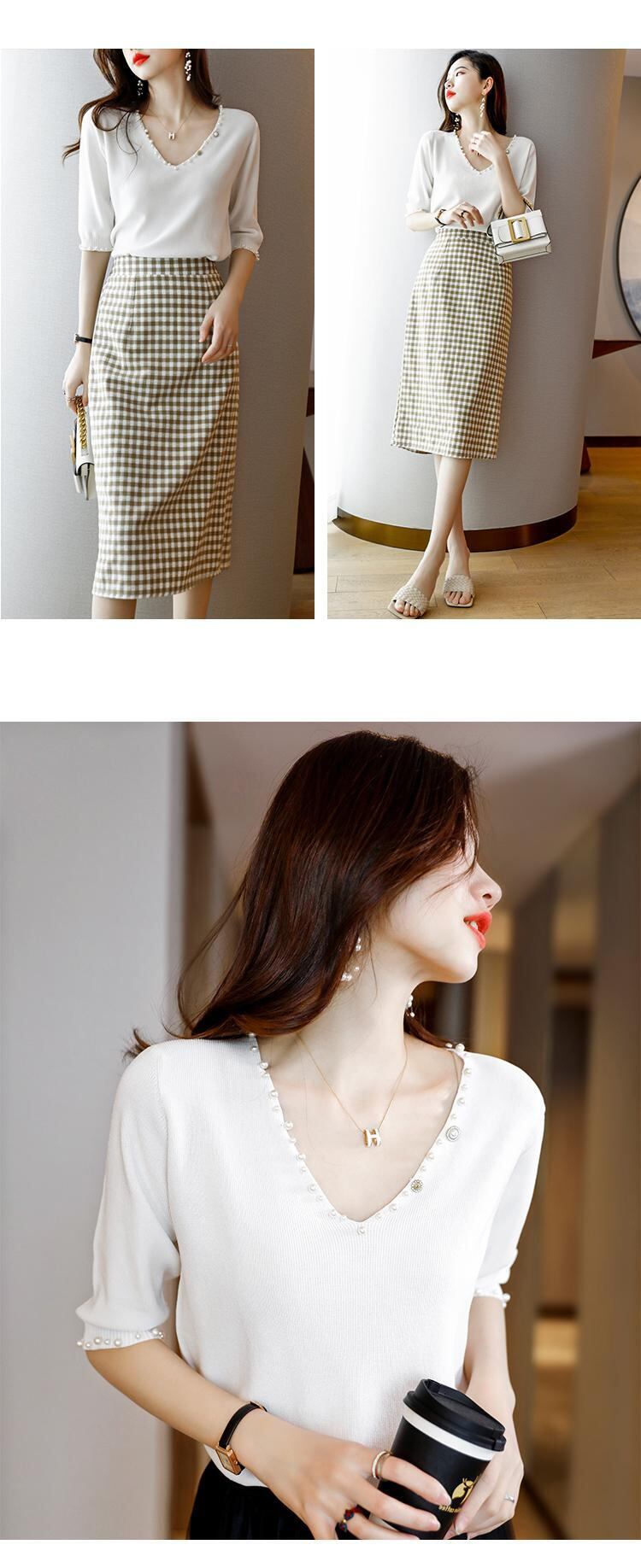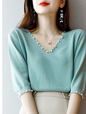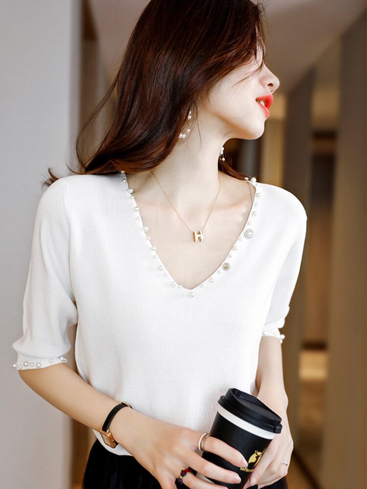 送料無料 ビーズ Tシャツ V ネックの女性 2022 ニットトップス夏薄い Tシャツ半袖 Tシャツ女性服 Camiseta ショート ハーフスリーブ サマー 夏物 Vネック AE1212887738795292785