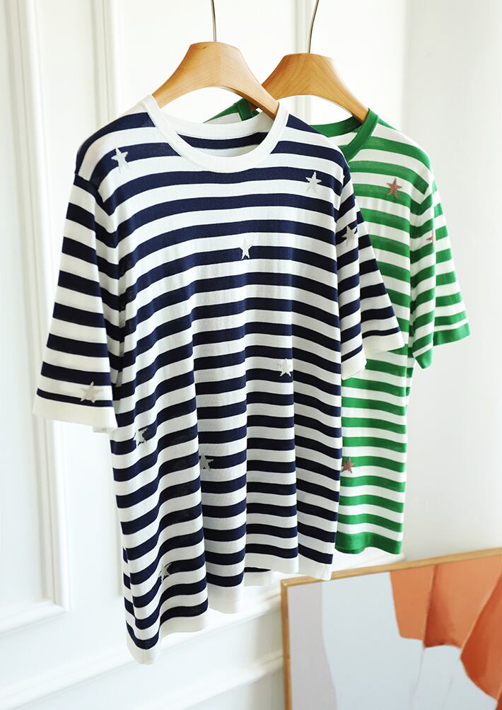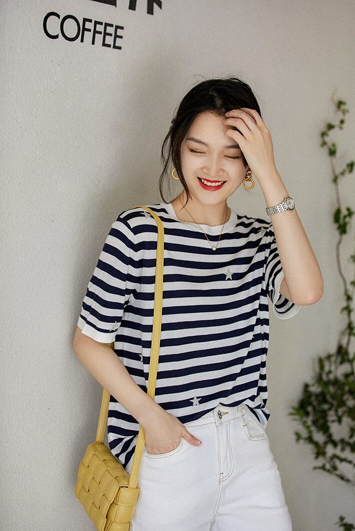 送料無料 ストライプ Tシャツ女性プリント Tシャツ 2022 夏薄いニットトップス半袖 Tシャツ女性服 ショート ハーフスリーブ サマー 夏物 AE1212887792239072459