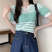 送料無料 ストライプ Tシャツ女性ホワイトレースアップクロップトップ 2022 夏の女性半袖 Tシャツニット Tシャツオー ショート ハーフスリーブ サマー 夏物 AE1212887741910050074 | 女性の為の通販サイト-fashion navi